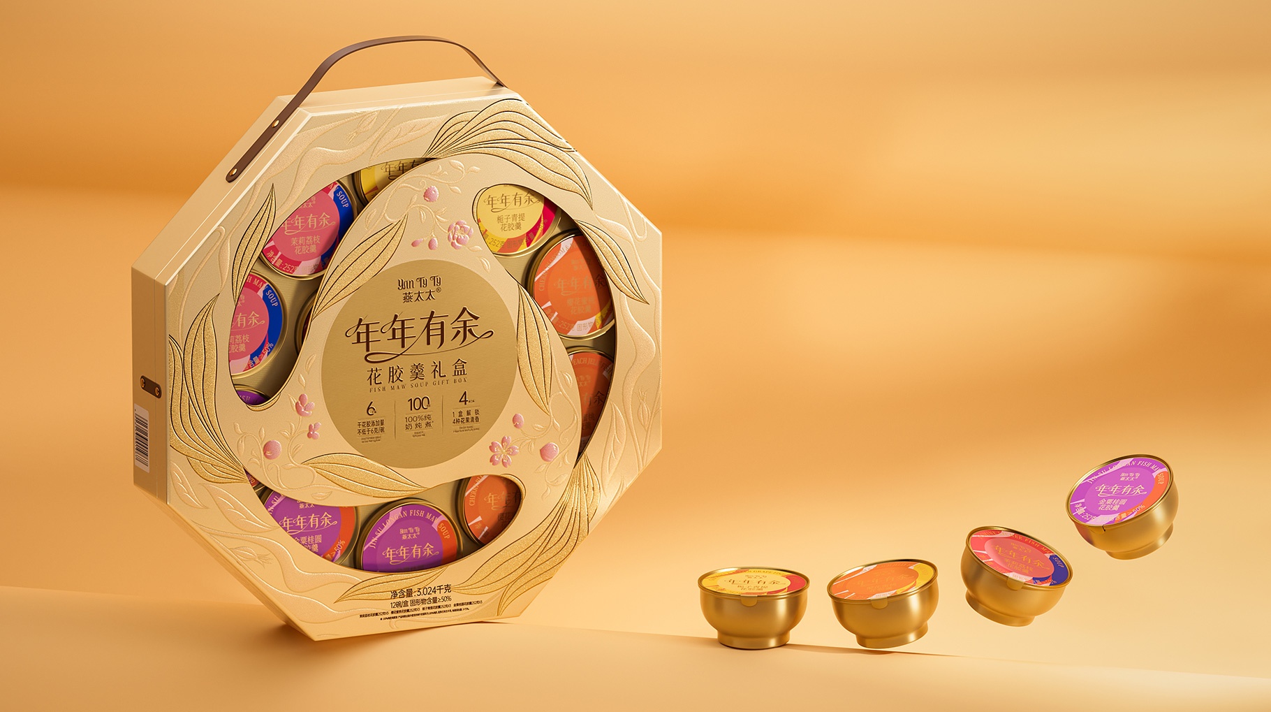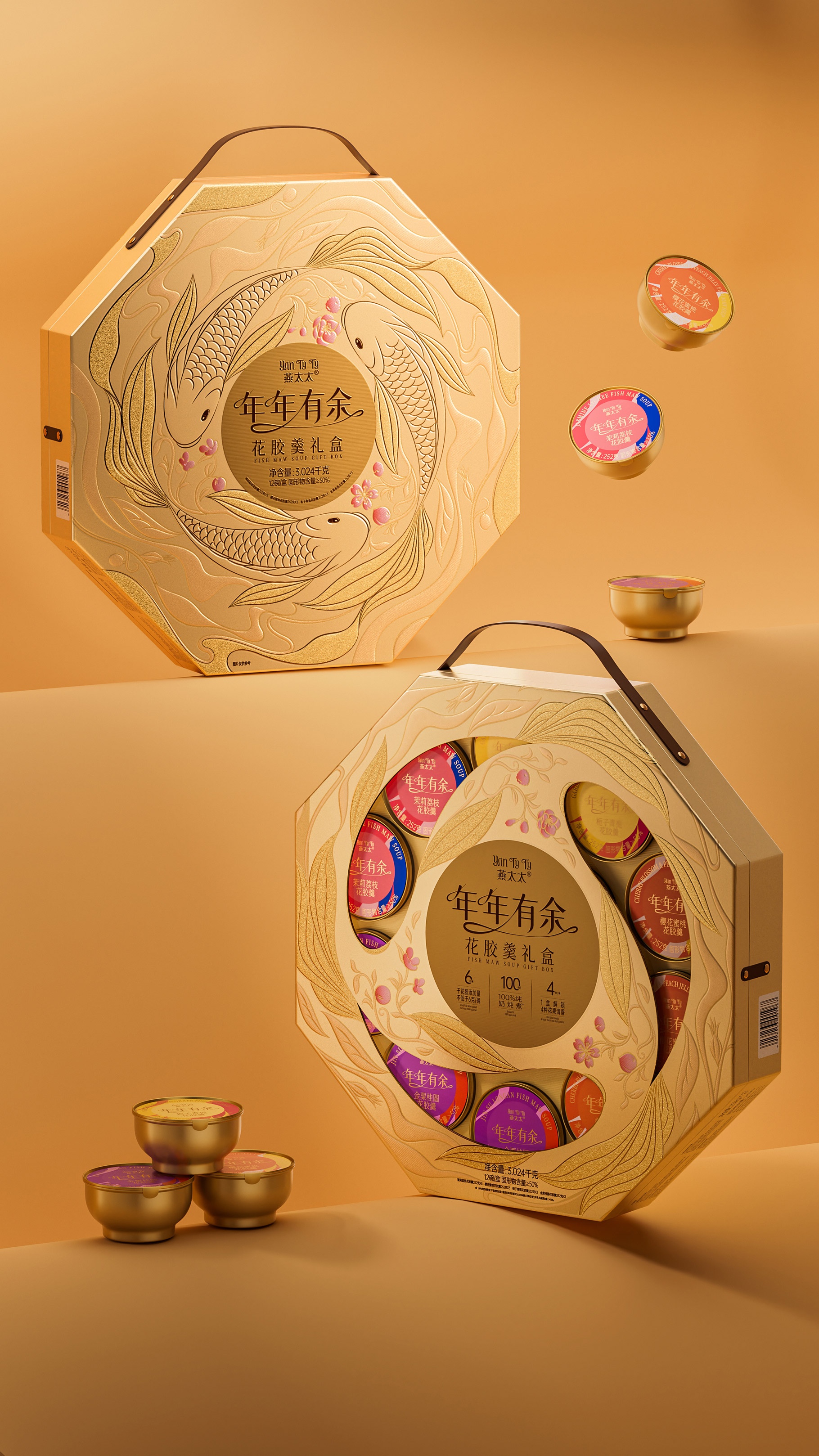 燕太太為山姆會員店精心專供的新年花膠羹禮盒產品,團隊在思考新年禮盒產品的時候,旨在通過一款獨特而富有深意的包裝設計,傳達出對美好未來的期許與祝福。此設計以“年年有余”為主題,巧妙融合魚與不同口味主題花卉的元素,通過完美旋轉的圖案創意,打造出一款既體現傳統韻味又不失現代美感的新年花膠羹禮盒。